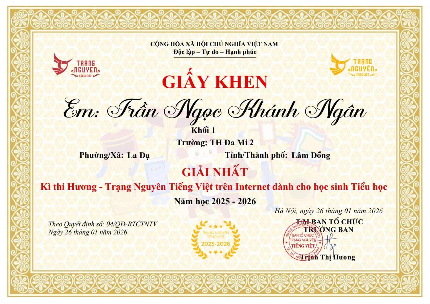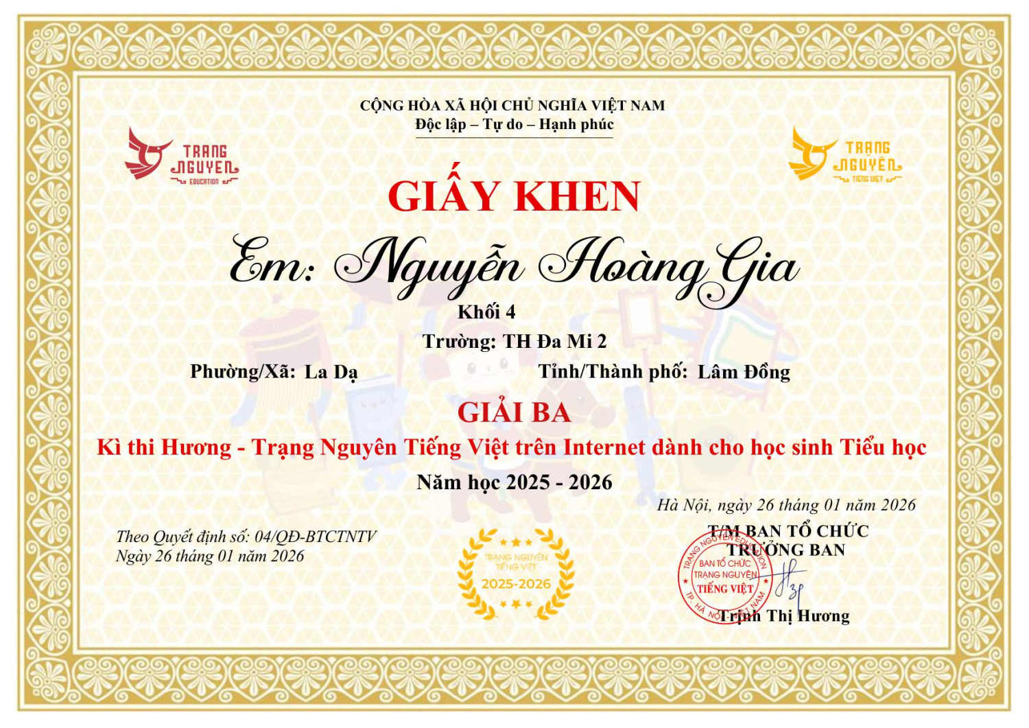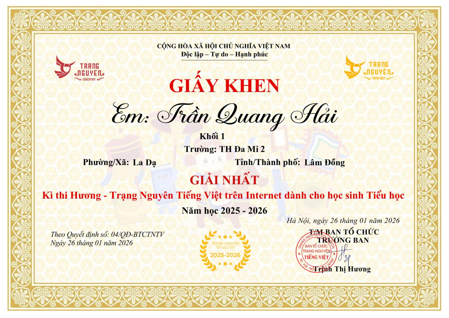 Nhà trường xin ghi nhận và biểu dương thành tích của em, đồng thời chúc em tiếp tục giữ vững phong độ, tự tin bước vào các vòng thi tiếp theo và gặt hái thêm nhiều thành công.