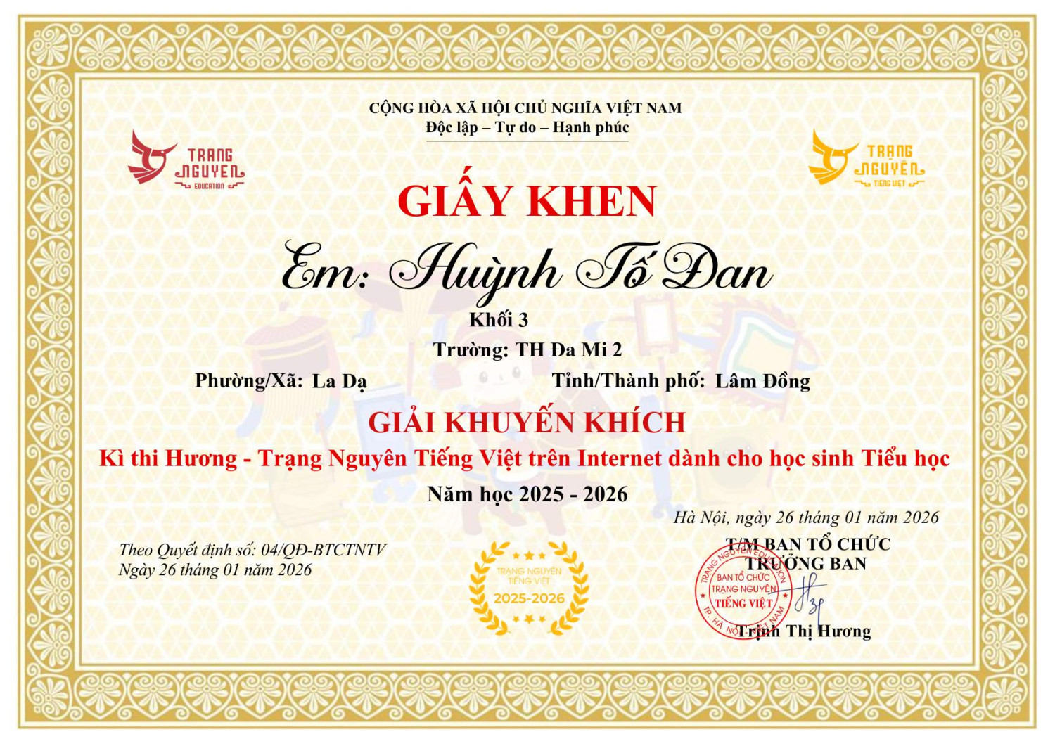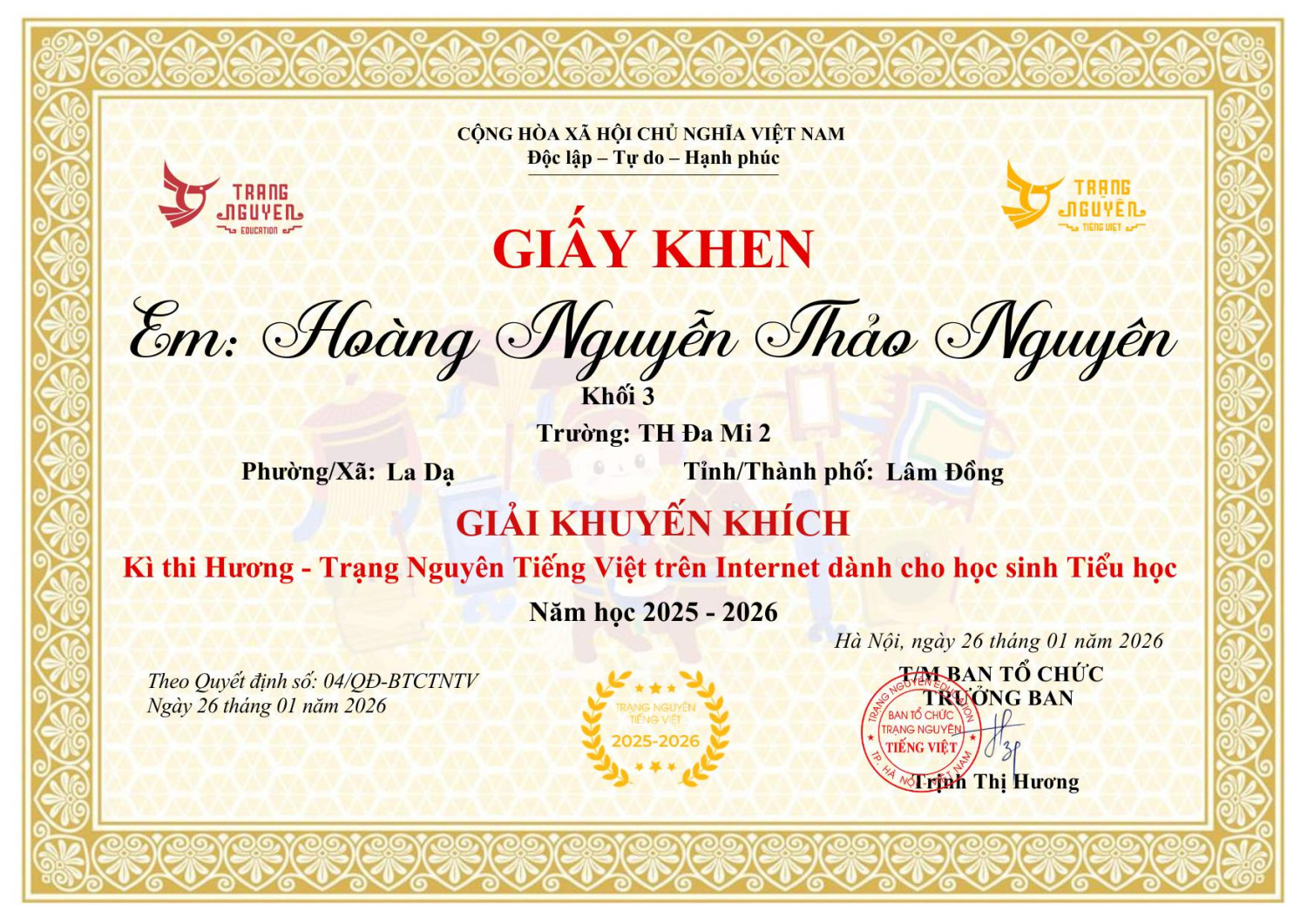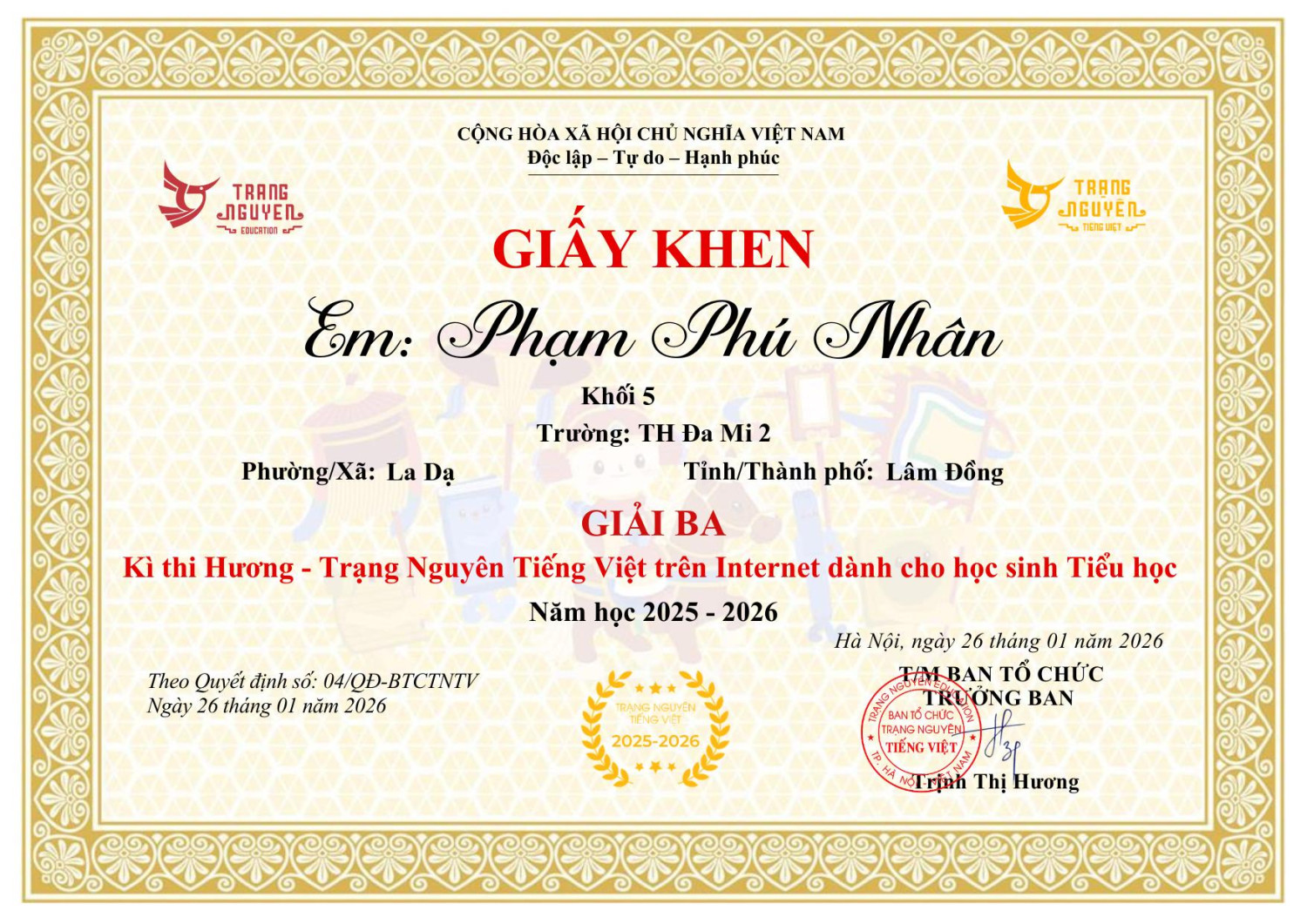 Nhà trường xin ghi nhận và biểu dương thành tích của em, đồng thời chúc em tiếp tục giữ vững phong độ, tự tin bước vào các vòng thi tiếp theo và gặt hái thêm nhiều thành công.
