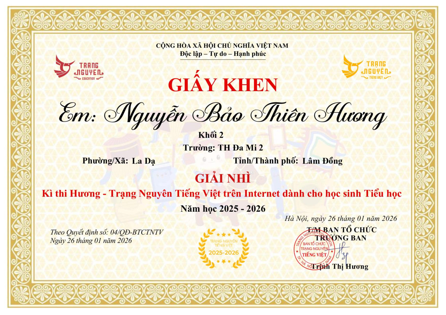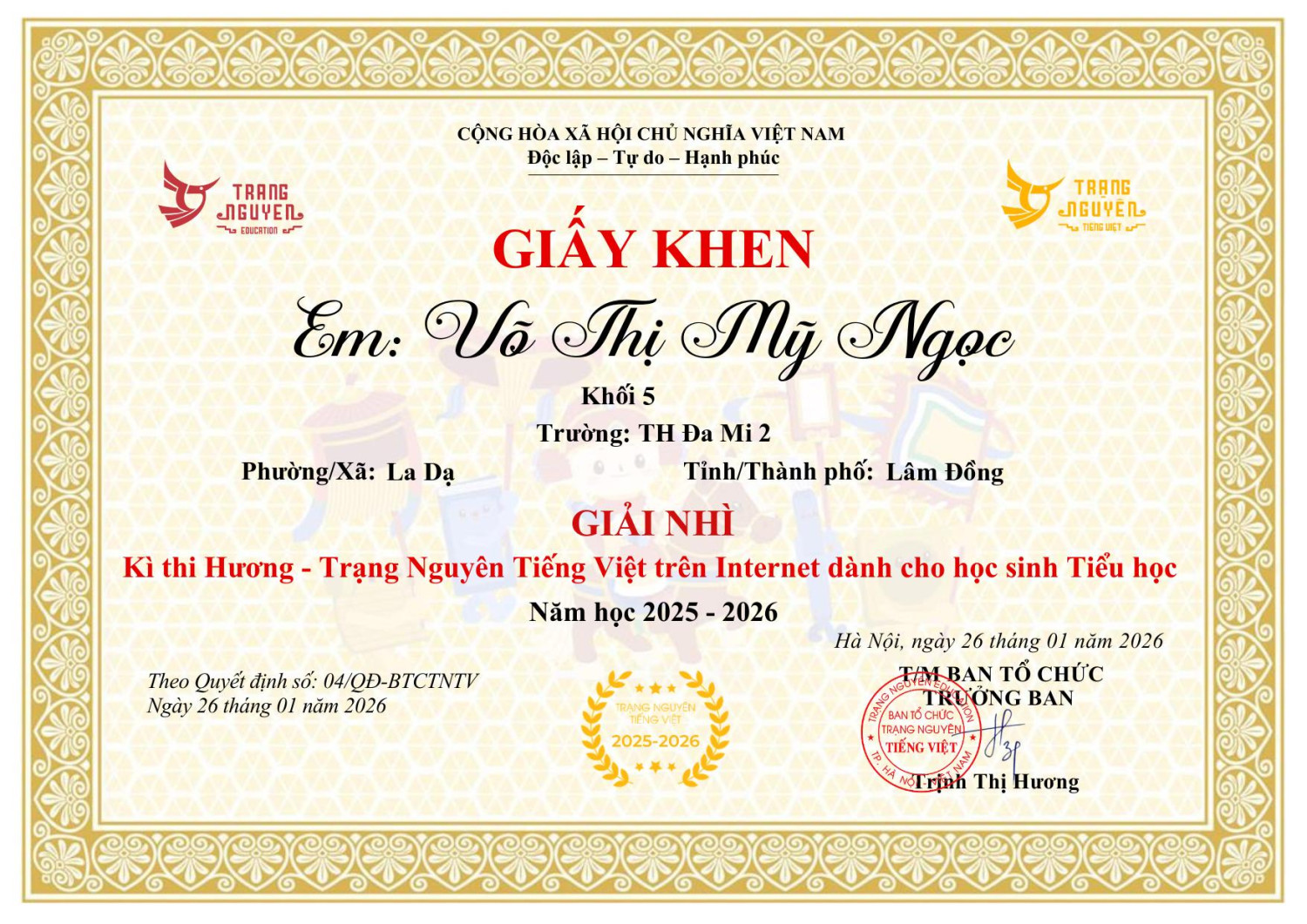 HỌC SINH TRƯỜNG TIỂU HỌC ĐA MI 2, XÃ LA DẠ, TỈNH LÂM ĐỒNG XUẤT SẮC ĐẠT GIẢI “TRẠNG NGUYÊN TIẾNG VIỆT” – VÒNG THI HƯƠNG