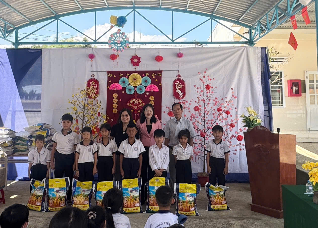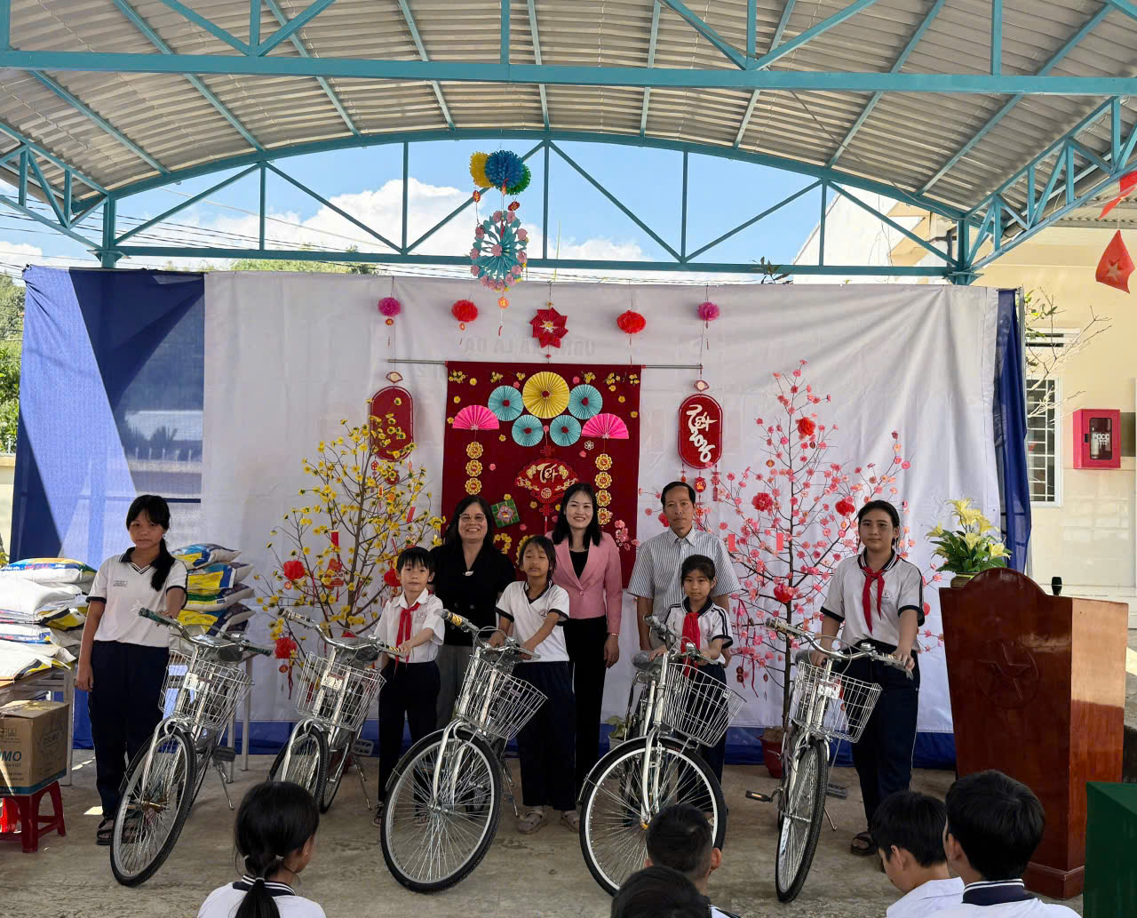 ⭐ Trong dịp này, nhà trường đã trao tặng 10 chiếc xe đạp cho học sinh có hoàn cảnh khó khăn, tạo điều kiện thuận lợi để các em đến trường; 13 phần quà là gạo dành cho học sinh có hoàn cảnh đặc biệt khó khăn. Đồng thời, các mạnh thường quân cũng trao 01 máy tính xách tay hỗ trợ công tác cho bộ phận kế toán nhà trường và 22 phần quà là gạo cho giáo viên có quãng đường công tác xa, góp phần chia sẻ khó khăn, động viên tinh thần thầy cô trong dịp Tết.